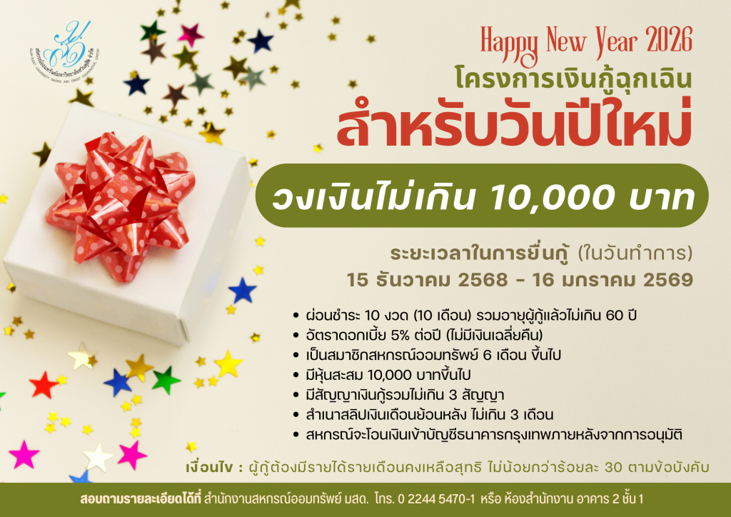 โครงการเงินกู้ฉุกเฉินสำหรับวันปีใหม่ 20/11/202520/11/2025 duangkamol_cha กิจกรรม, ไม่มีหมวดหมู่ โครงการเงินกู้ฉุกเฉินสำหรับวันปีใหม่ 2569Download เอกสารในการขอกู้เงิน คำขอกู้เงินปีใหม่Download หนังสือสัญญาปีใหม่Download หนังสือยินยอมให้หักเงินชำระหนี้สหกรณ์ปีใหม่Download หนังสือขอรับเงินกู้วันปีใหม่Download เอกสารแนบ1.สำเนาสลิปเงินเดือน 1 ฉบับ (เดือนปัจจุบันหรือย้อนหลังได้ไม่เกิน 3 เดือน)2.สำเนาหน้าสมุดบัญชีธนาคารกรุงเทพ 1 ฉบับ เว็บสหกรณ์ออมทรัพย์ 2 duangkamol_cha